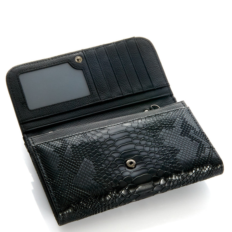 Cadena larga en interior. Tarjetero en interior. Tamaño: 18 cm ancho x 12 alto x 3 fondo. Composición: piel.