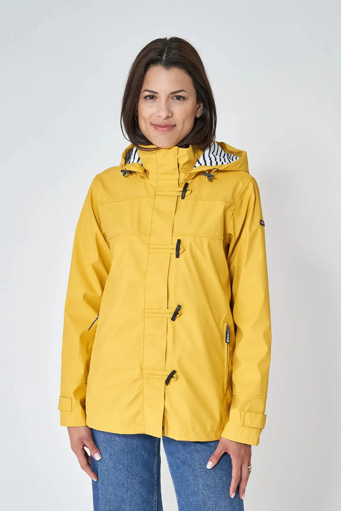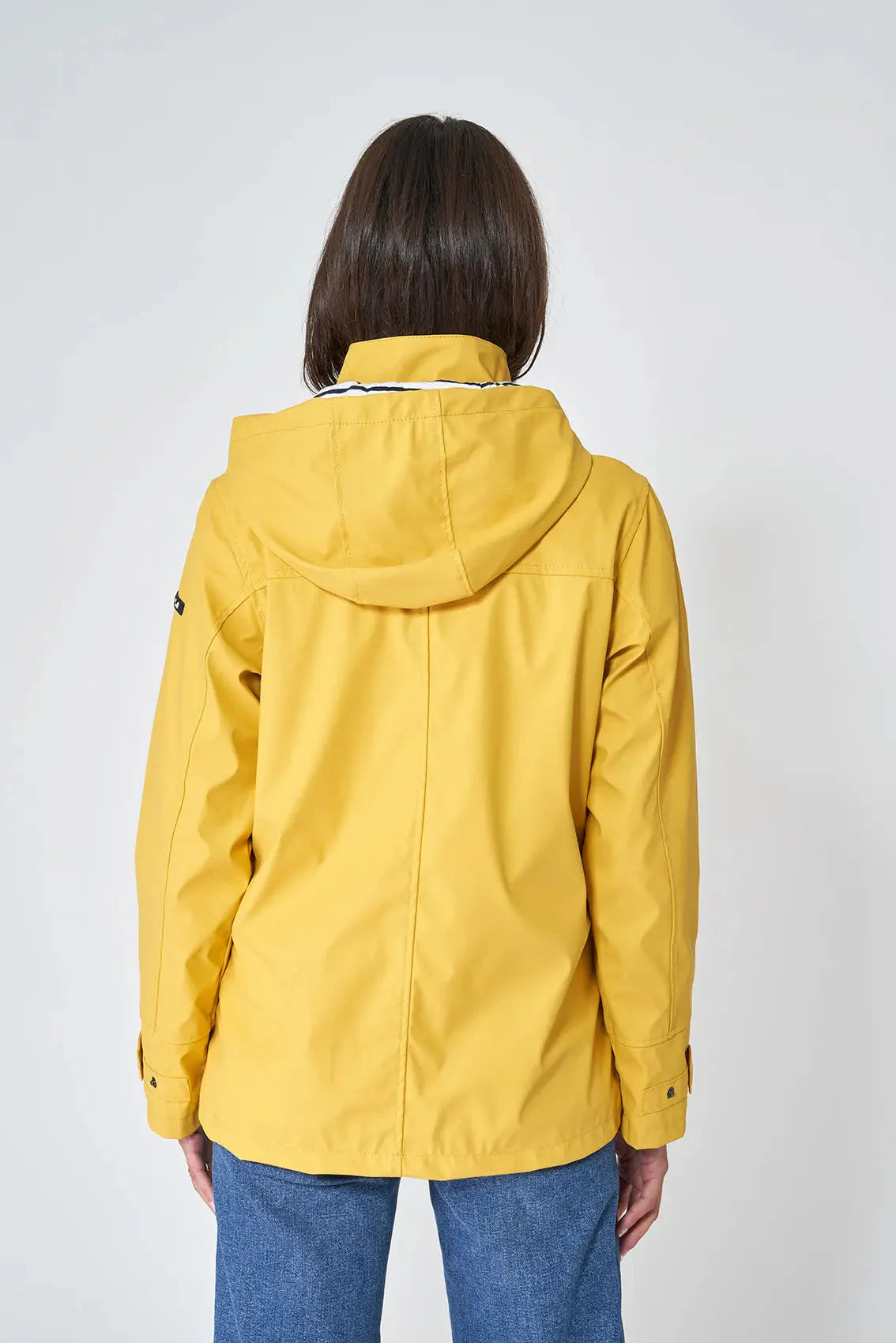 - Capucha extraíble con cordón, unida al cuello con cremallera de resina. La pieza con cremallera se puede ocultar en el interior del cuello.