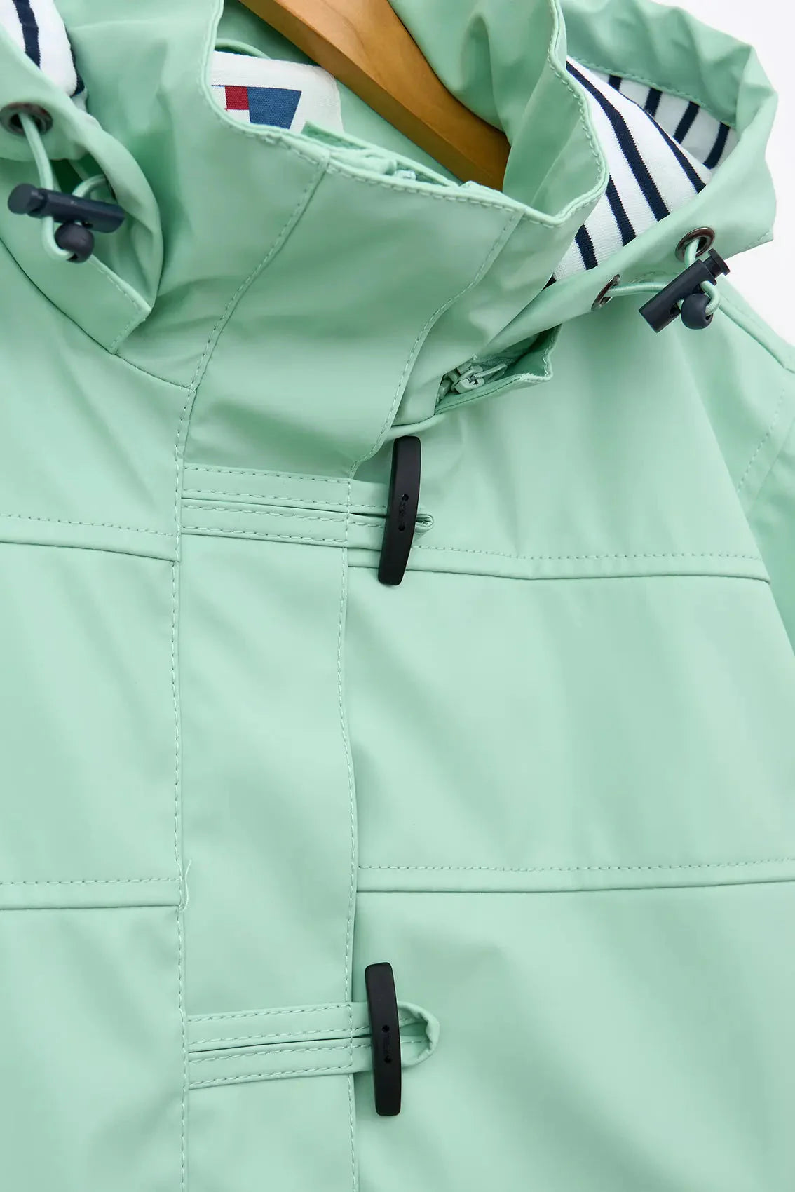 - Capucha extraíble con cordón, unida al cuello con cremallera de resina. La pieza con cremallera se puede ocultar en el interior del cuello.