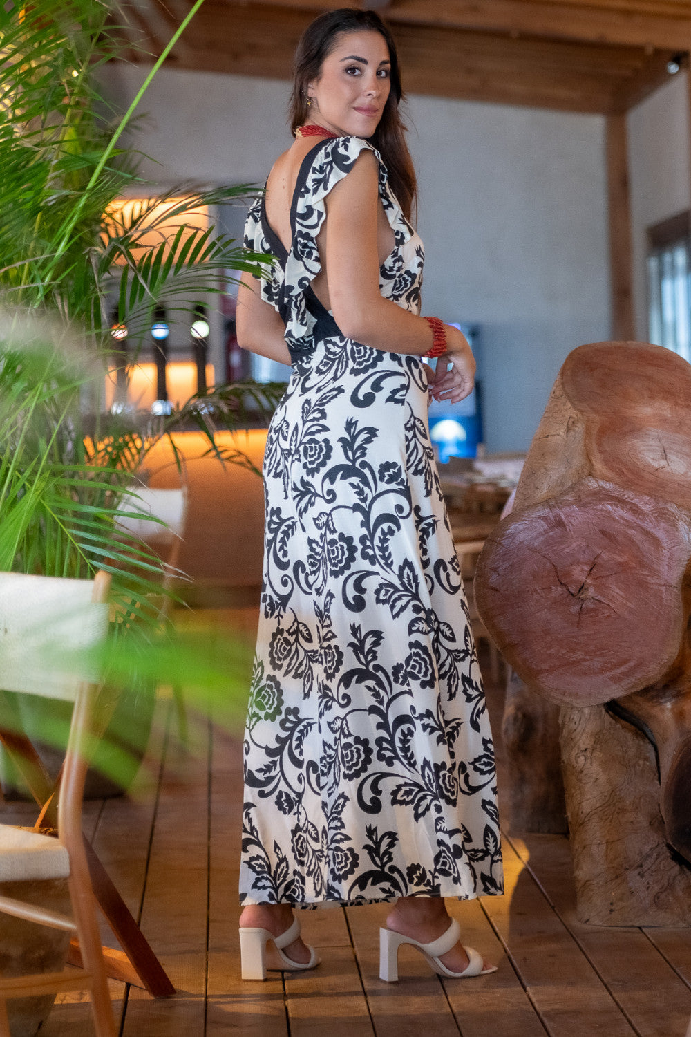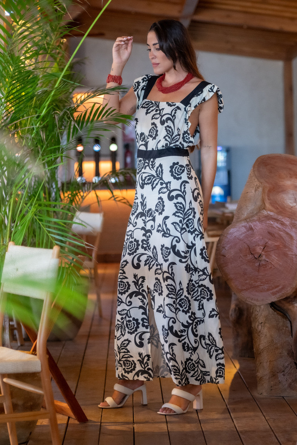 Vestido largo evasé con tiranta ancha y cinturilla a contraste. escote cuadrado y espalda cruzada con volante. Tejido en viscosa y estampado en blanco y negro con contraste en negro Sunset Moon. Calidad: 100% Viscosa